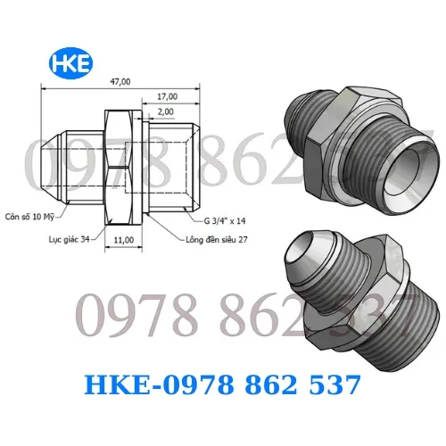 - Rắc co thuỷ lực Ren 27 G3/4” – số 10 Mỹ được sử dụng để kết nối các thiết bị thuỷ lực như van, bơm, xi lanh và ống dẫn dầu trong hệ thống truyền động. Nó giúp tạo liên kết bền vững, đảm bảo dòng dầu chảy ổn định – không rò rỉ – an toàn tuyệt đối.